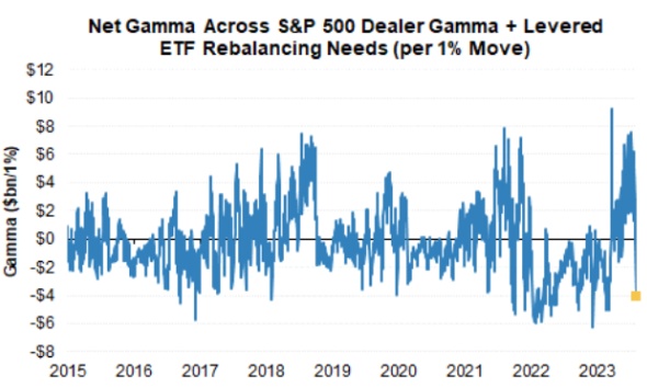 McElligott指出,上周五发生的情况就是这样,当时许多平价看跌期权的持有者获利,标普500指数也从盘中低点反弹。他说:“他们在当天结束前平仓了那些看跌期权,以便变现,这让我们重新振作起来。这更多的是相同的0DTE抑制波动现象,因为它们要么在大多数时候毫无价值地到期,要么在货币中,当收盘变现时,你会得到一个逆转的变动。”