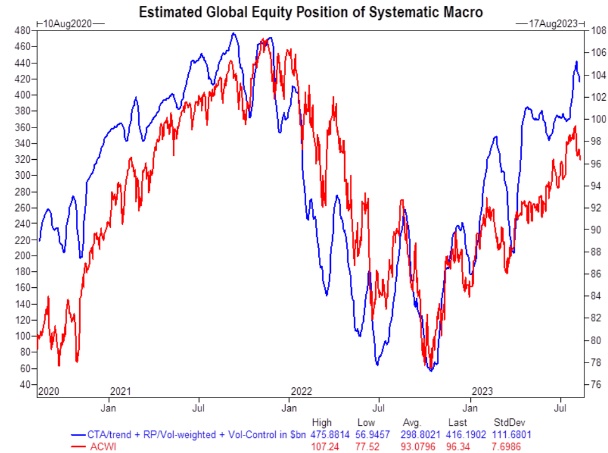大宗商品交易顾问(CTA)通过在期货市场做多或做空来把握资产价格走势,他们持有的股票太多了,以至于Rubner表示,即便是小幅回调也会引发剧烈的平仓。他说,值得关注的一个数据是标普500指数的50日移动均线。自今年3月银行业危机爆发以来,这条接近4438点的趋势线从未被突破。他的模型显示,CTA指数若跌破4278点,中期动能可能转为负值。这一水平接近该指数的100日平均水平。