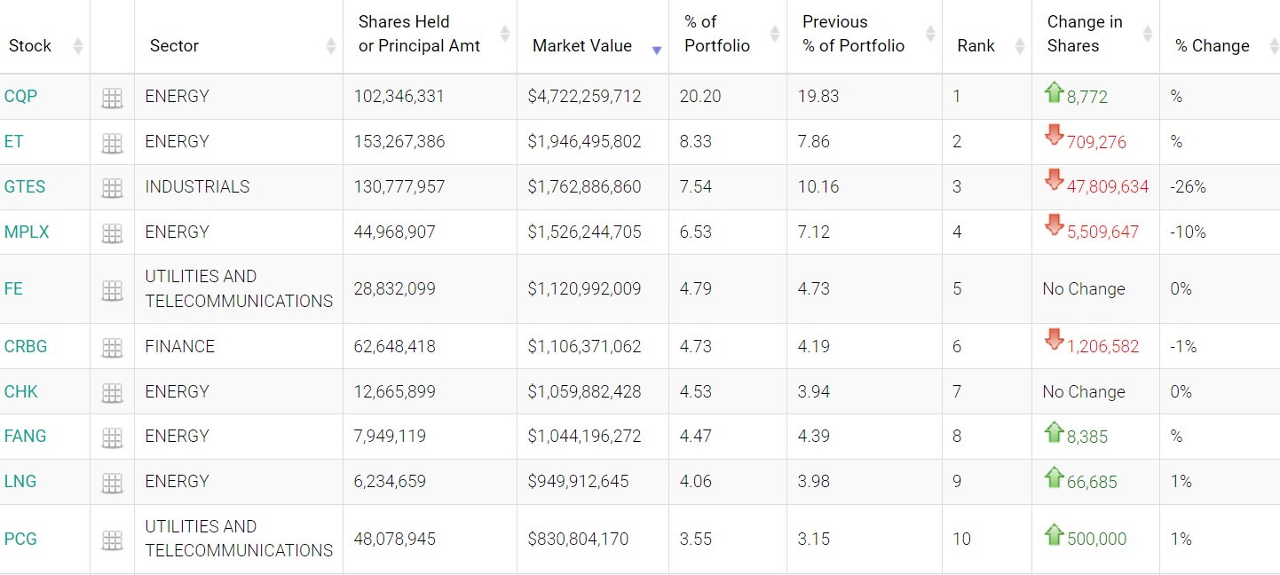 MPLX L.P. (MPLX.US)位列第四,持仓约4497万股,持仓市值约15亿美元,占投资组合比例为6.53%,较上季度持仓数量减少10%。