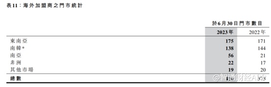 与国内加盟店大量关闭所不同的是,上半年佐丹奴海外加盟店达410家,较2022年同期增加37家。其中南亚、东南亚及非洲市场加盟店有所上升,而南韩以及其他市场则有所下降。