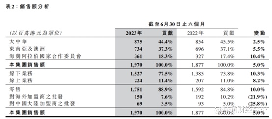 再看销售渠道方面,佐丹奴销售渠道包括线上及线下。线下业务是佐丹奴的收入主要来源,上半年公司线下收入15.27亿港元,占比达77.5%,较2022年同期增长10.3%;线上业务收入2.24亿港元,占比11.4%,较2022年同期增长8.2%。