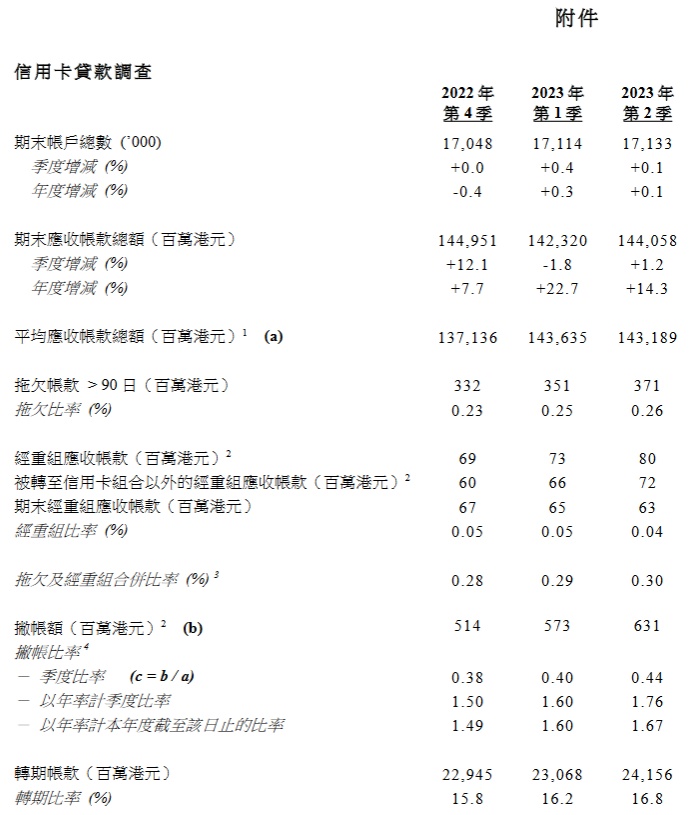 智通财经APP获悉,8月15日,香港金融管理局公布2023年第2季信用卡贷款调查结果。据披露,信用卡应收帐款总额在上季减少1.8%后,于2023年第2季上升1.2%至6月底的1441亿港元。拖欠及经重组合并比率由上季末的0.29%轻微上升至2023年6月底的0.30%。信用卡季度撇帐率亦由上季的0.40%上升至0.44%。