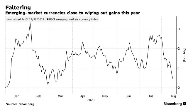 这似乎表明,在经历了两年的货币紧缩后,投资者对有意义的刺激措施失去了耐心,与此同时,各国政府和央行发现,他们满足这种愿望的能力受到通胀或汇率风险的限制。这种因素已经导致了新兴市场股市连续第六年跑输美股,当地货币指数也接近抹去其在2023年的所有涨幅。