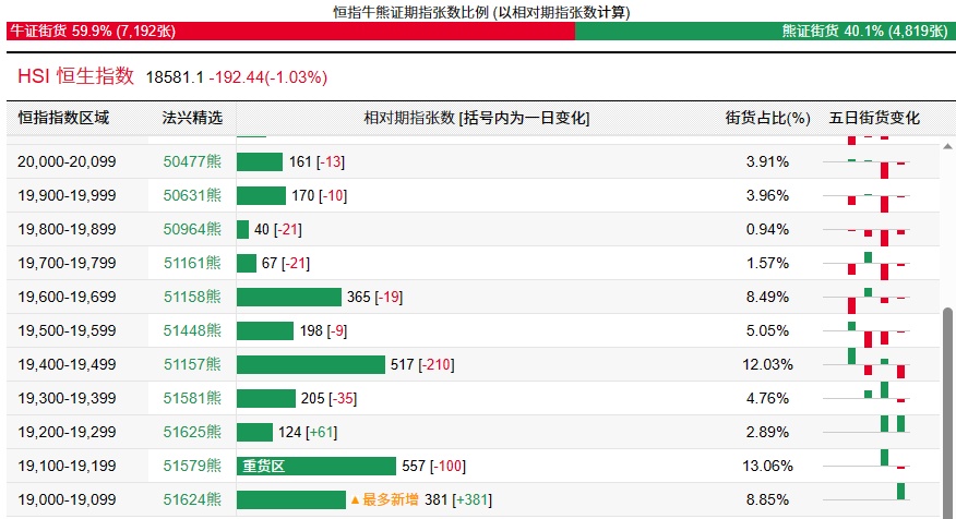 法兴恒指牛熊证街货分布图中的数据显示,熊证街货重货区在19100-19199区间,该区间最新熊证数量为557张,较上一交易日减少100张,最多新增在19000-19099区间,该区间最新熊证数量为381张,较上一交易日增加381张。