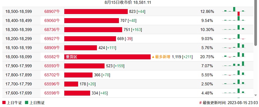 牛证街货重货区在18000-18099区间,该区间最新牛证数量为1119张,较上一交易日增加211张。最多新增在同一区间。