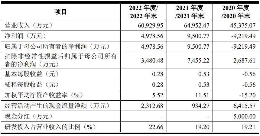 财务方面,于2020年度、2021年度及2022年度,公司实现营业收入分别约为4.54亿元、6.50亿元、6.09亿元。公司净利润分别约为-9219.49万元、9500.77万元、4978.56万元人民币。