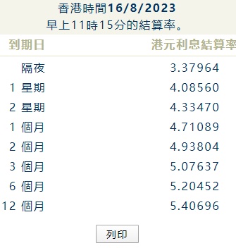 智通财经APP获悉,8月16日,港元拆息继续走软。除了一年期外,其他各期拆息全线下跌,其中,隔夜息连跌两天,今日微跌至3.37964%,创近一周新低,与楼按相关的一个月拆息亦降至4.71089%,为6月14日以来最低,与同期美元LIBOR息差扩阔至72基点。反映银行资金成本的三个月拆息亦跌至5.07637%,见近一个月新低,与同期美元LIBOR息差扩阔至56基点,六个月期亦降至5.20452%,但一年期连升两天,升至5.40696%。
