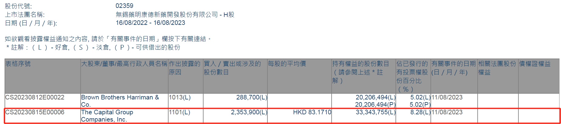 智通财经APP获悉,香港联交所最新资料显示,8月11日,美国资本集团增持药明康德(02359)235.39万股,每股作价83.1710港元,总金额约为1.96亿港元。增持后最新持股数目约为3334.38万股,最新持股比例为8.28%。