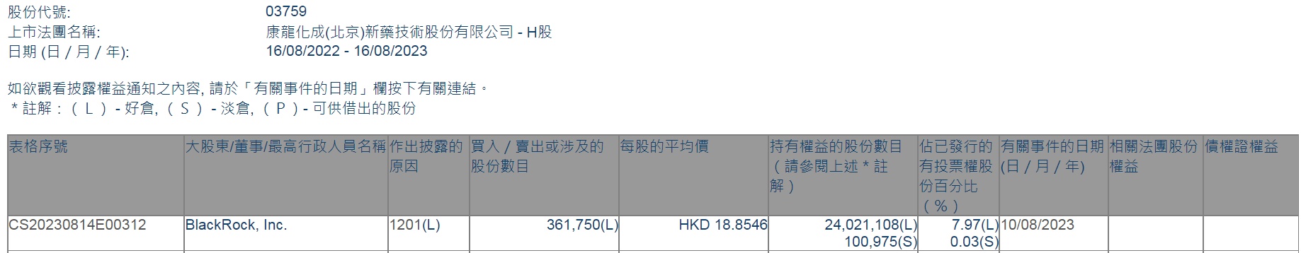 智通财经APP获悉,香港联交所最新资料显示,8月10日,贝莱德减持康龙化成(03759)36.175万股,每股作价18.8546港元,总金额约为682.07万港元。减持后最新持股数目为2402.11万股,最新持股比例为7.97%。