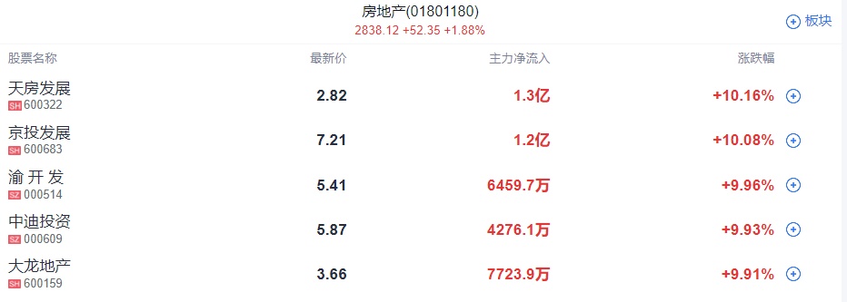 房地产板块强势,天房发展、京投发展、渝开发、中迪投资、大龙地产等多股涨停。