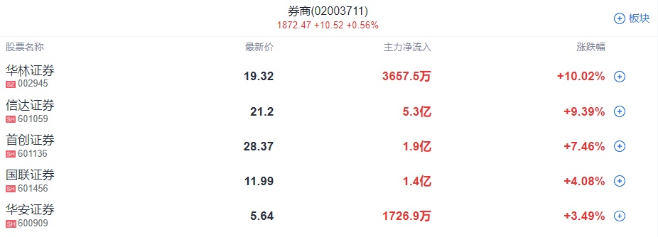 券商股探底回升,持续走高,华林证券走出2连板,信达证券、首创证券一度涨停,首创证券盘中一度创历史新高。