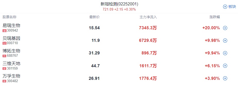 医药股再度走强,新冠检测方向领涨,易瑞生物20%涨停,贝瑞基因涨停,万孚生物、博拓生物、达安基因等拉升。