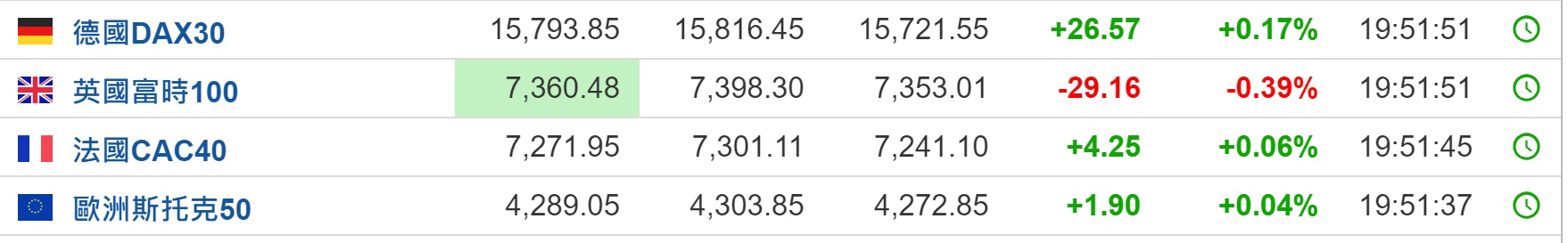 2. 截至发稿,德国DAX指数涨0.17%,英国富时100指数跌0.39%,法国CAC40指数涨0.06%,欧洲斯托克50指数涨0.04%。