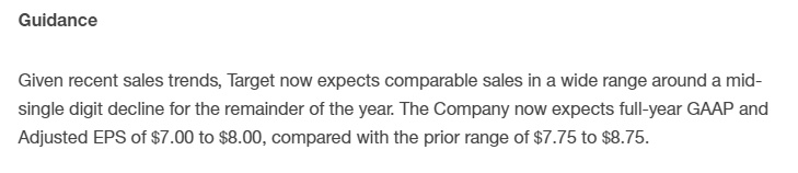 预期方面,塔吉特在业绩展望中下调了2023年全年销售额和利润预期。塔吉特表示,2023年调整后的每股收益将在7美元至8美元之间。7.50美元的中间值比之前预测区间要低(之前的预期区间为7.75美元至8.75美元之间),并且最新预期中值低于分析师平均预期的7.80美元。塔吉特目前预计年度可比销售额将出现中个位数(通常来说预期5%左右)下降,而之前的预测是低个位数下降到低个位数增长。