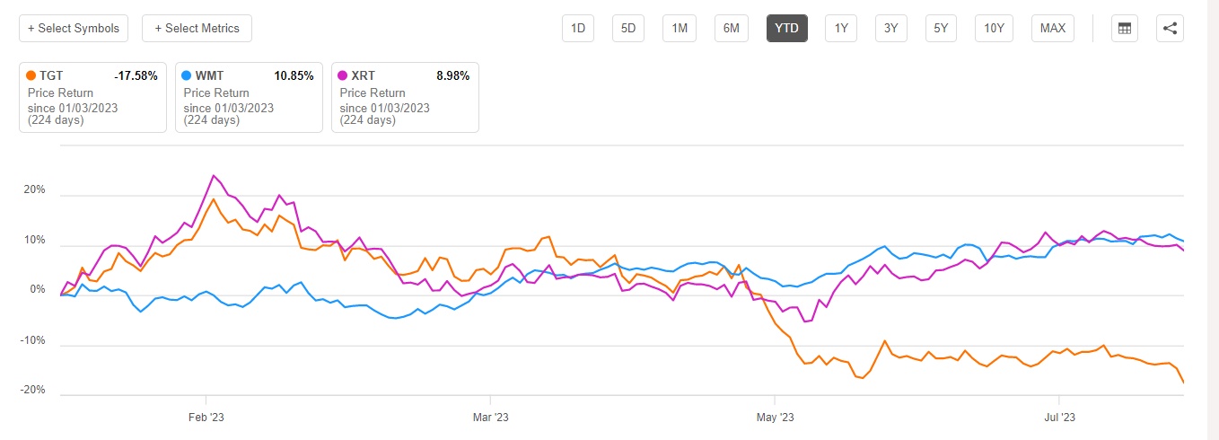 截至周二美股收盘,塔吉特股价今年下跌大约17%。相比之下,涵盖美国主要消费品公司的标普零售ETF上涨近9%,同为零售巨头的沃尔玛上涨近11%。而美股大盘——标普500指数同期涨幅高达16%。