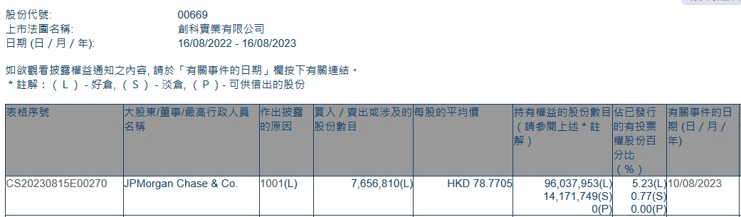 智通财经APP获悉,香港联交所最新资料显示,8月10日,小摩增持创科实业(00669)765.6810万股,每股作价78.7705港元,总金额约为6.03亿港元。增持后最新持股数目约为9603.80亿股,最新持股比例为5.23%。