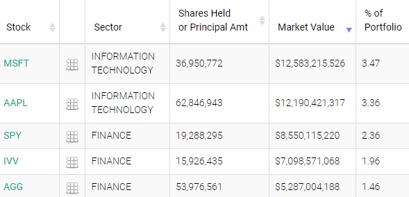 SPDR标普500指数ETF(IVV.US)、iShares美国全债市ETF(AGG.US)分别位列第四、第五,持仓市值分别为71亿美元、52.87亿美元,占投资组合比例分别为1.96%、1.46%。