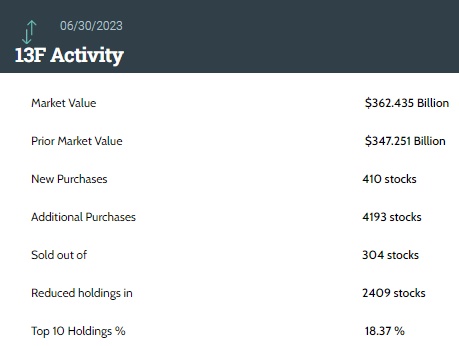 富国银行Q2持仓总市值为3624.35亿美元,上一季度为3472.51亿美元,环比增长4%。富国银行在Q2的投资组合中新增了410只标的,增持4193只标的,减持2409只标的,清仓304只标的;其中前十大持仓标的占总市值的18.37%。