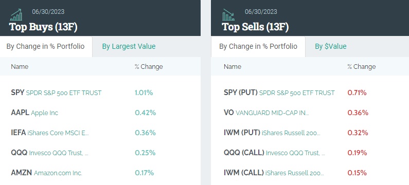 从持仓比例变化来看,前五大买入标的分别是:标普500指数ETF、苹果、iShares安硕核心MSCI EAFE ETF(IEFA.US)、纳指100ETF(QQQ.US)和亚马逊(AMZN.US)。