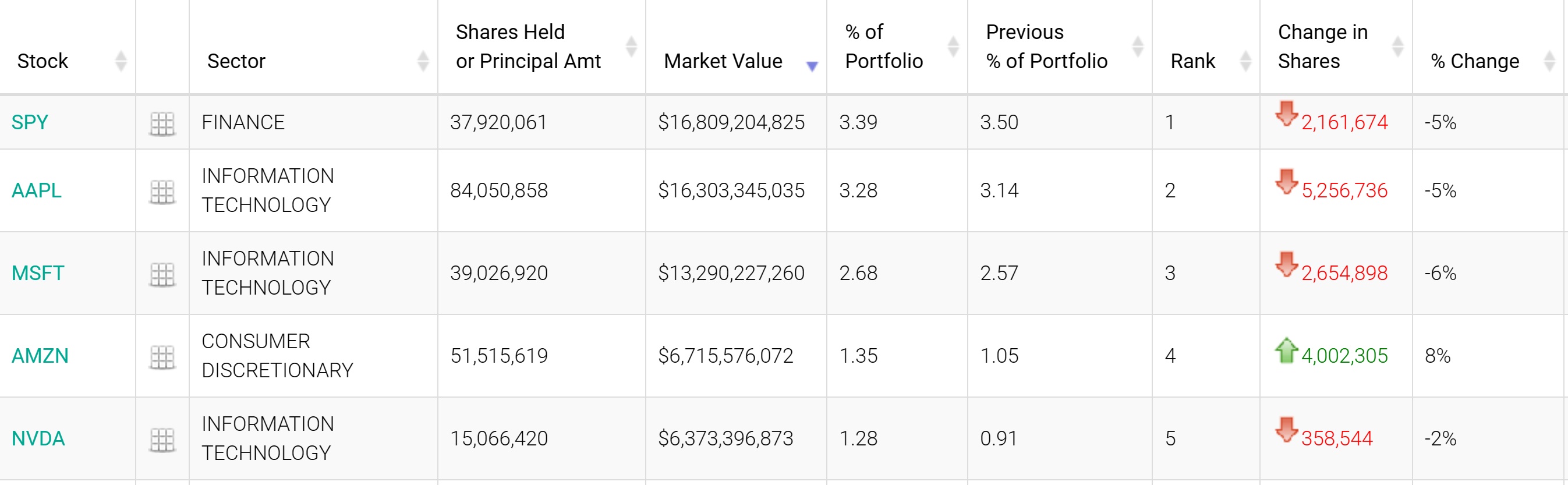 在前五大重仓股中,标普500指数ETF(SPY.US)仍位列第一,持仓约3792.01万股,持仓市值约168.09亿美元,占投资组合比例为3.50%,持仓数量较上季度下降5%。