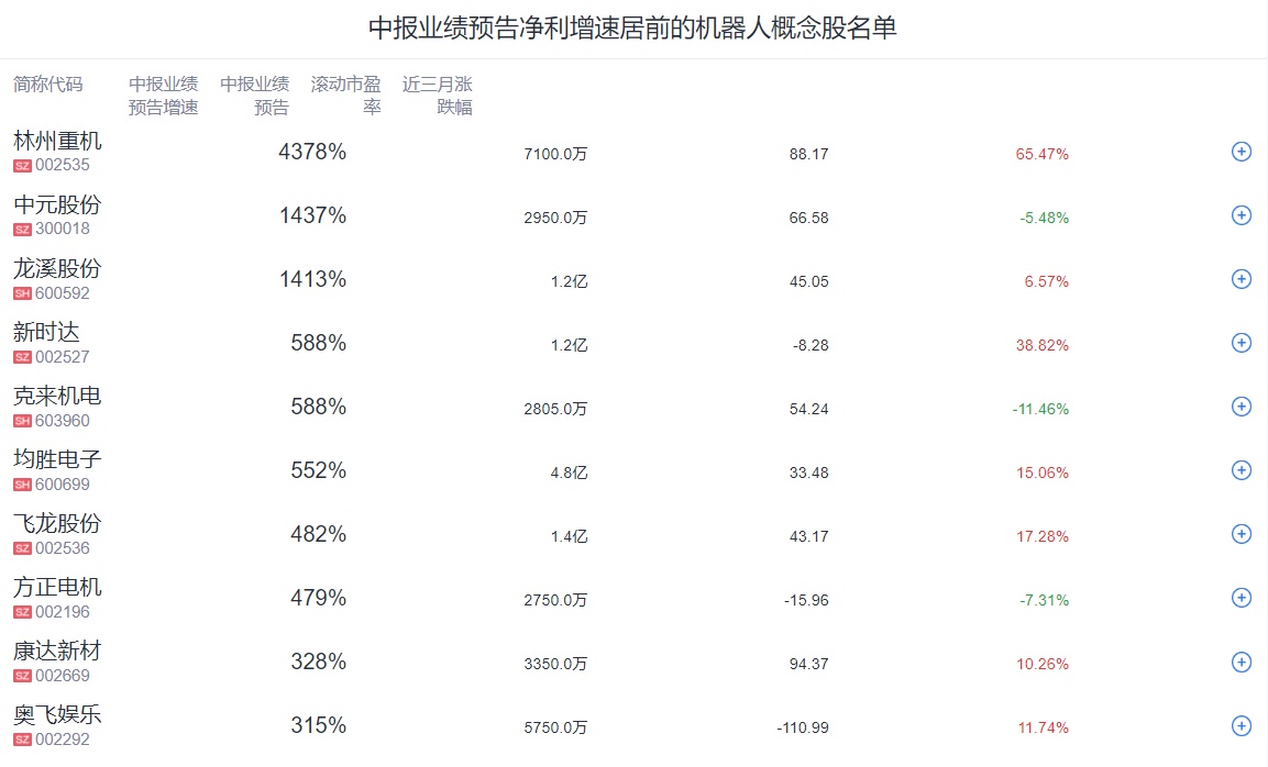 此外,腾讯自选股统计了中报预告净利增速靠前的机器人概念股名单,供您参考。数据显示,林州重机中报业绩预告增速达4378%;此外,中元股份、龙溪股份、新时达等股中报预告业绩亦表现亮眼。