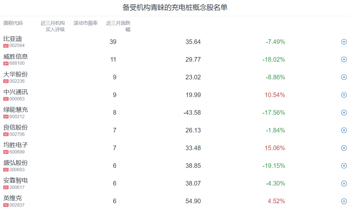 腾讯自选股也梳理了近三月获机构看好的充电桩概念股,仅供读者参考。数据显示,近三个月比亚迪获39家机构给出买入评级;此外,威胜信息、大华股份、中兴通讯等股亦备受青睐。