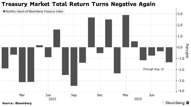智通财经APP获悉,根据彭博美债指数,截止到周二,美国政府票据和债券年初至今的回报率为-0.13%。由于美联储最新公布的会议纪要显示存在进一步加息的风险,10年和30年美债的收益率在周三达到了今年的最高水平,因此损失预计将加深。