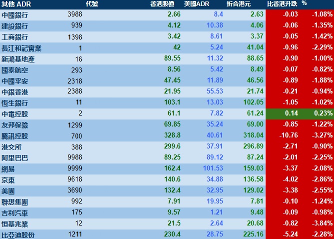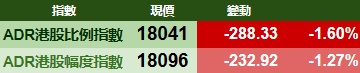 智通财经APP获悉,周三美股三大指数集体收跌,港股ADR指数下跌,按比例计算,收报18041点,较香港收市跌288.33点或1.60%。