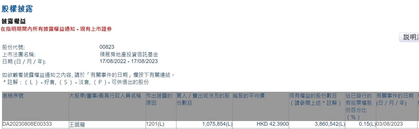 智通财经APP获悉,领展(00823)股价承压之际,港交所资料显示,领展行政总裁王国龙于8月3日减持107.58万股,每股平均价42.39港元,套现约4560万港元,持股量降至0.15%。16日,王国龙回应,指出是个人财务需要,强调并非看淡公司前景,目前未有进一步减持计划,直言并非“一个人可以影响股价很多”。他认为,股价下跌与高息有关,但领展业务具抗逆力,并持续派息,相信当息口回落,对股价有正面作用。