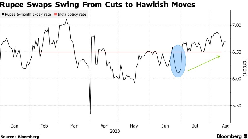在印度,6个月期单日掉期利率反映出在这段时间内利率将上升近20个基点,此前该利率在6月底暗示将降息25个基点。这是因为飙升的食品价格推动7月份通胀率五个月来首次超过印度联储2%-6%的目标区间。