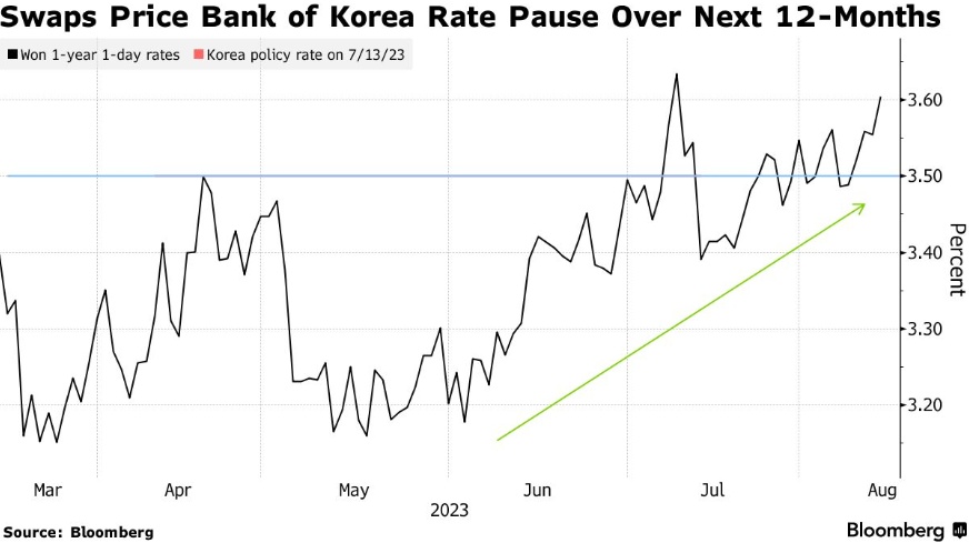 韩国掉期指标目前暗示利率在未来12个月内不会有任何变化,而该指标在5月底暗示将降息近25个基点。在7月召开的议息会议上,韩国央行6个委员都对将利率上调25个基点至3.75%的可能性持开放态度。下一次会议将于8月24日举行。