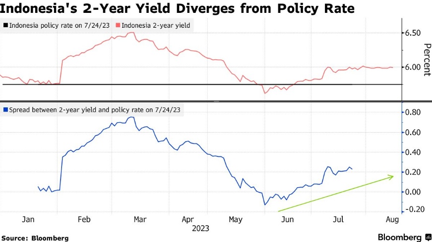 印尼对利率敏感的两年期国债收益率上升,扩大了与央行政策利率的利差,这一利差在5月底时低于零。此举标志着对印尼央行的鸽派押注正在减弱,特别是自那时以来,印尼盾的表现一直落后于东南亚货币。