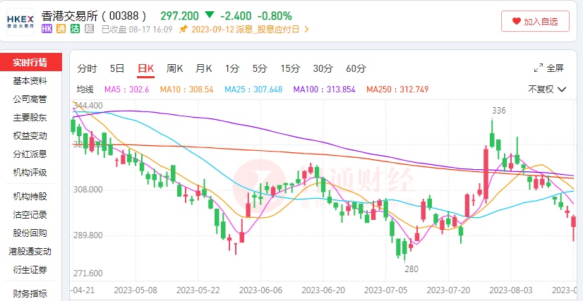 二级市场方面,港交所股价自今年1月9日创下378.71港元/股的阶段性高点以来,持续震荡下跌,截止17日收盘,股价期间累计跌幅超20%。