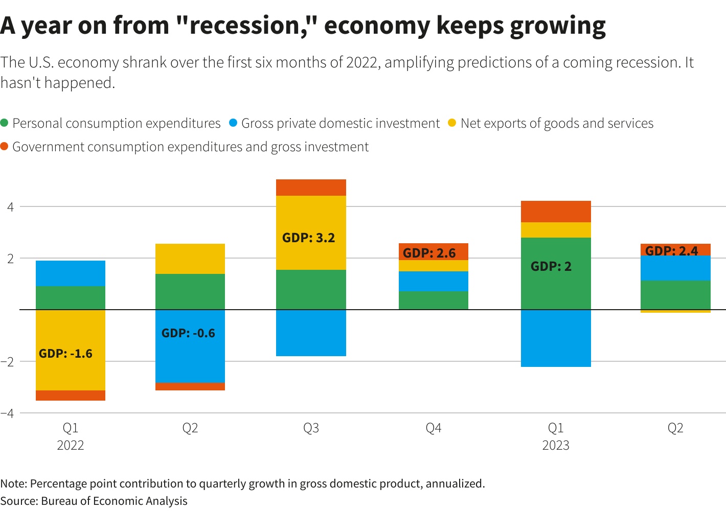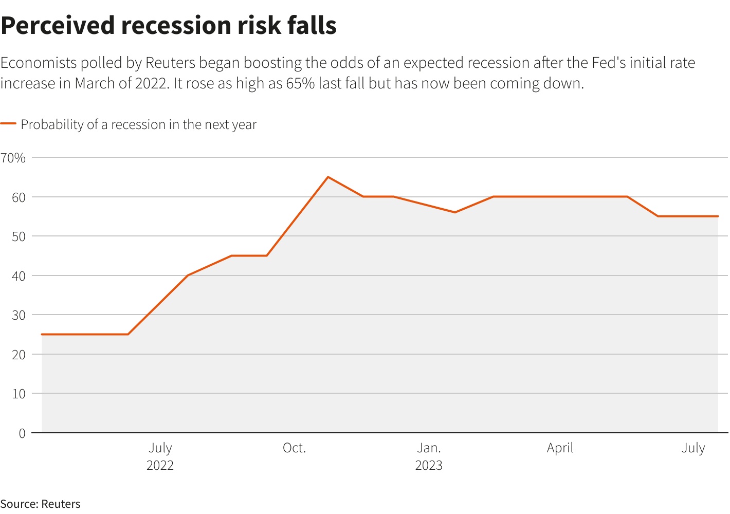 然而,一年过去了,美国7月失业率回落至3.5%的数十年低点,低于许多分析师预期的水平,再加上消费者支出也依然强劲,许多专业的经济学家都对他们的预测进行了修正。
