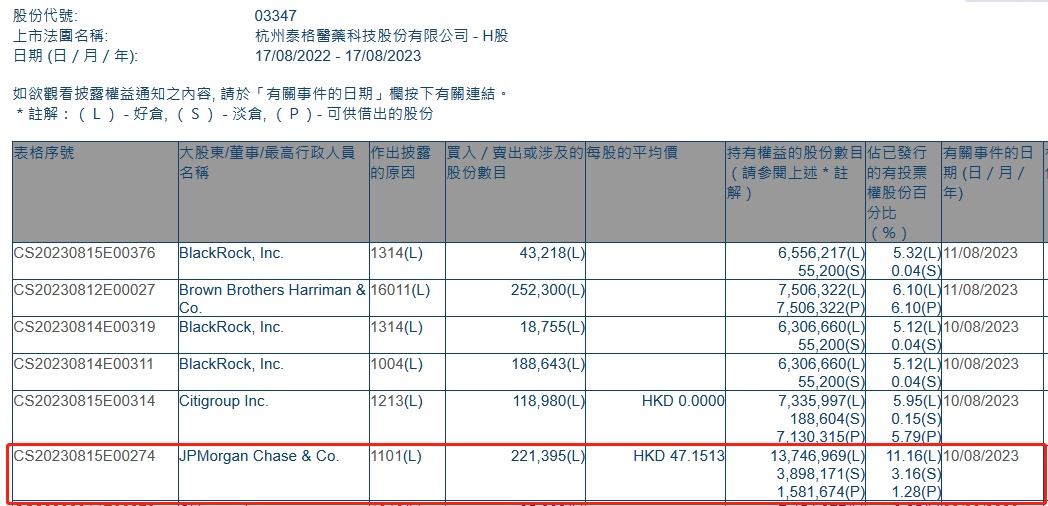 智通财经APP获悉,香港联交所最新资料显示,8月10日,小摩增持泰格医药(03347)22.1395万股,每股作价47.1513港元,总金额约为1043.91万港元。增持后最新持股数目约为1374.70万股,最新持股比例为11.16%。