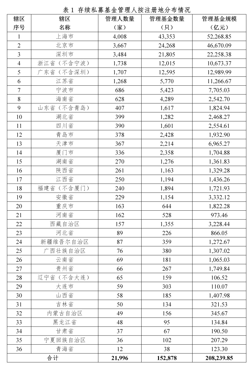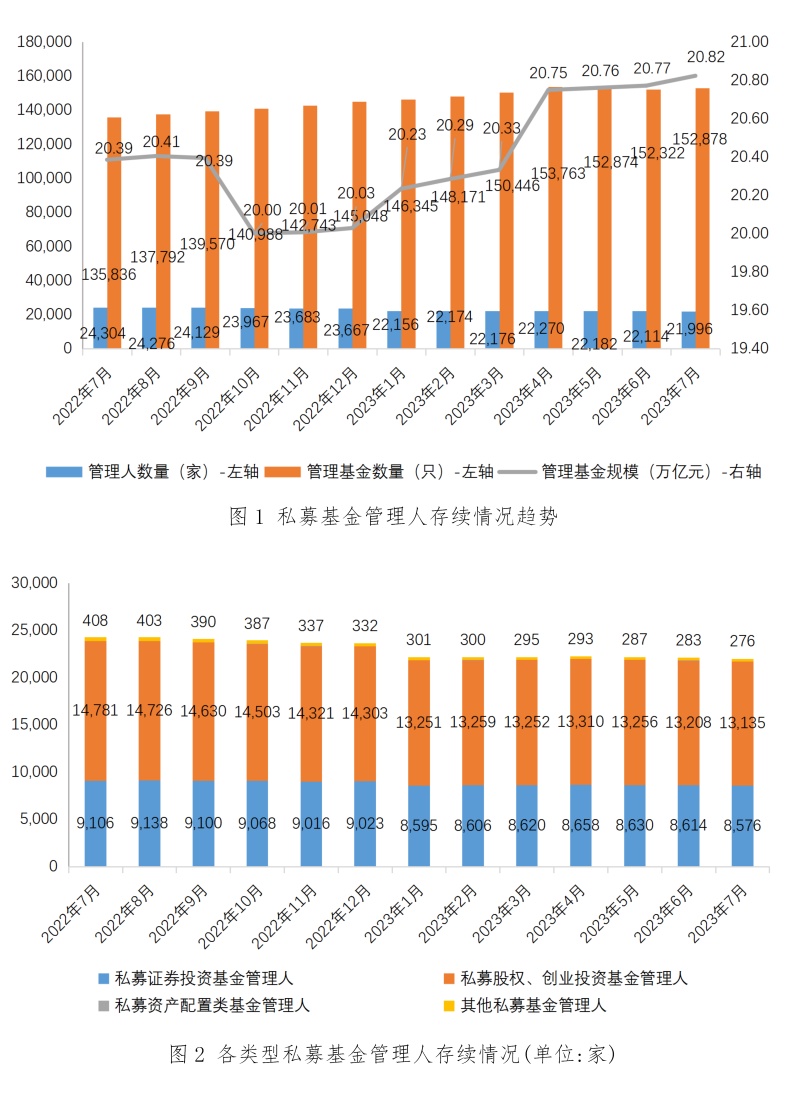 截至2023年7月末,存续私募基金管理人21996家,管理基金数量152878只,管理基金规模20.82万亿元。其中,私募证券投资基金管理人8576家,私募股权、创业投资基金管理人13135家,私募资产配置类基金管理人9家;其他私募投资基金管理人276家。