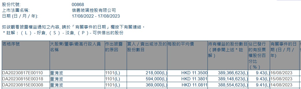 智通财经APP获悉,香港联交所最新资料显示,8月14日至16日,执行董事兼副主席<span style=" PingFang SC", "PingFang HK", "Helvetica Neue", sans-serif, Arial; WHITE-SPACE: normal; WORD-SPACING: 0px; TEXT-TRANSFORM: none; FLOAT: none; COLOR: ; ORPHANS: 2; WIDOWS: 2; DISPLAY: inline !important; LETTER-SPACING: normal; TEXT-INDENT: 0px; -webkit-text-stroke-width: 0px; text-decoration-style: initial; text-decoration-color: initial">董清波分别增持信义玻璃(00868)36.9万、59.4万、21.8万股,每股作价分别为11.0811港元、11.3801港元、11.3500港元,总金额为1332.30万港元。增持后最新持股数目约为3.89亿股,最新持股比例为9.43%。