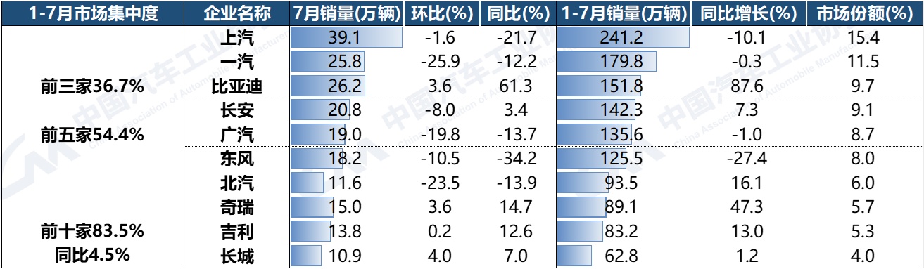 智通财经APP获悉,8月18日,据中国汽车工业协会统计分析,2023年1-7月,汽车销量排名前十位的企业(集团)销量合计为1304.8万辆,同比增长4.5%,占汽车销售总量的83.5%,低于上年同期2.8个百分点。上述十家企业中,与上年同期相比,比亚迪(002594.SZ)销量增速最为显著,奇瑞、北汽和吉利(00175)也呈两位数增长,长安(000625.SZ)和长城(02333)小幅增长,其他企业呈不同程度下降。