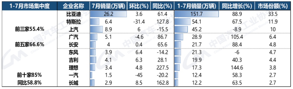 2023年1-7月,新能源汽车销量排名前十位的企业(集团)销量合计为384.7万辆,同比增长55.8%,占新能源汽车销售总量的85%,高于上年同期7.7个百分点。整个新能源市场依旧处在快速增长阶段。