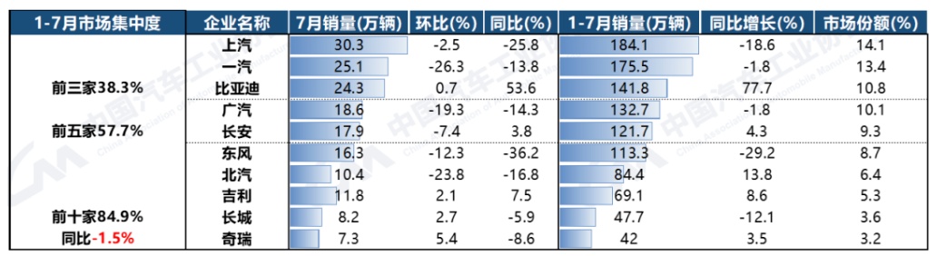 2023年1-7月,国内汽车销量排名前十位的企业(集团)销量合计为1112.2万辆,同比下降1.5%,占汽车销售总量的84.9%,低于上年同期2.1个百分点。
