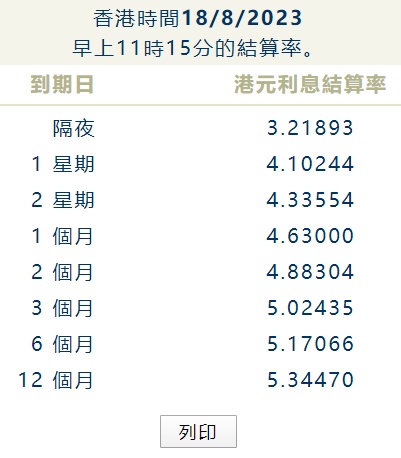 智通财经APP获悉,8月18日,港元三个月以下拆息几乎全线上升,仅与楼按相关的一个月拆息进一步跌至4.63%,续创6月14日以来最低,与同期美元LIBOR息差维持80基点。隔夜息结束三连跌,报3.21893%,一周拆息升至4.10244%,反映银行资金成本的三个月拆息亦略为回升至5.02435%,与同期美元LIBOR息差维持62基点。然而,长息向下,六个月拆息降至5.17066%,一年期连跌两天,报5.3447%。