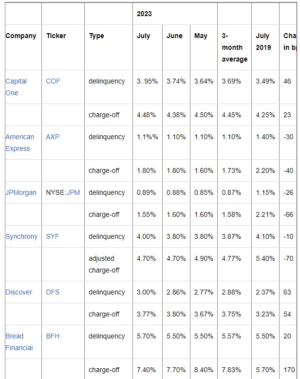 平均拖欠率和净冲销率被Bread Financial(BFH.US)的数据扭曲了,这些数据现在超过了疫情前的水平。不包括Bread Financial,平均拖欠率为1.98%,略高于6月份的1.95%,略低于7月份的2.28%。不包括Bread Financial在内的平均净冲销率为2.83%,较6月份的2.85%有所下降,仍比2019年7月的3.24%低41个基点。