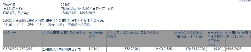 智通财经APP获悉,香港联交所最新资料显示,8月16日,蜀道投资增持四川成渝高速公路(00107)186.2万股,每股作价2.5251港元,总金额约为470.17万港元。增持后最新持股数目为1.70亿股,最新持股比例为19.02%。
