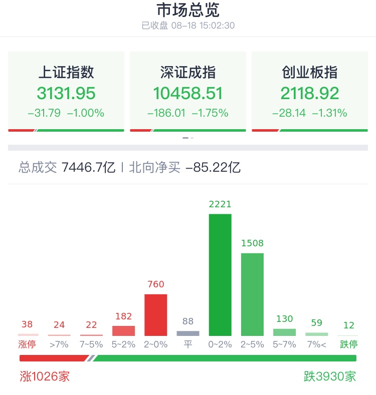 受此影响,今日A股冲高回落,午后持续走弱,深成指再创年内新低!截至收盘,沪指跌1.00%,报3131.95点;深成指跌1.75%,报10458.51点;创业板指跌1.31%,报2118.92点。