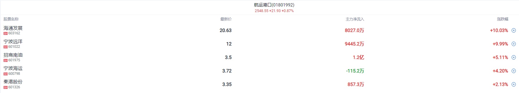 港口航运股震荡走高,海通发展、宁波远洋涨停,国航远洋、中远海能、招商南油等冲高。