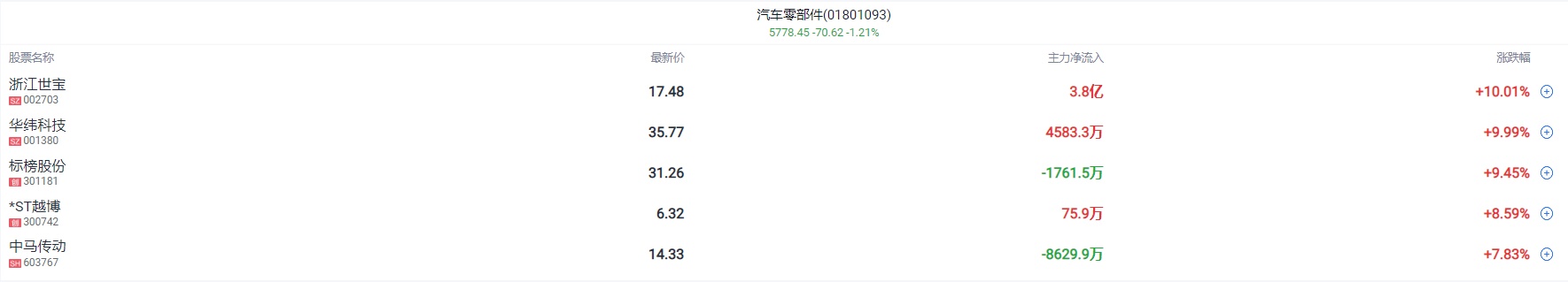 汽车零部件概念反复活跃,浙江世宝尾盘涨停,华纬科技涨停,宁波方正、兴民智通、上声电子等纷纷跟涨。