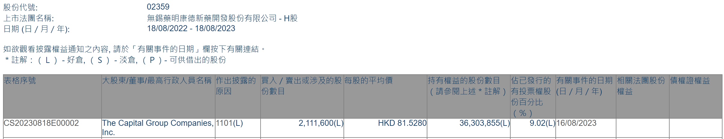 智通财经APP获悉,香港联交所最新资料显示,8月16日,美国资本集团增持药明康德(02359)211.16万股,每股作价81.528港元,总金额约为1.72亿港元。增持后最新持股数目约为3630.39万股,最新持股比例为9.02%。