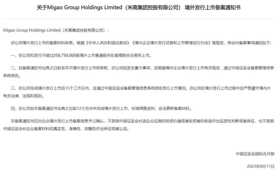 智通财经APP获悉,8月18日,中国证监会发布关于Migao Group Holdings Limited(米高集团控股有限公司)境外发行上市备案通知书,公司拟发行不超过2.5875亿股境外上市普通股并在香港联合交易所上市。