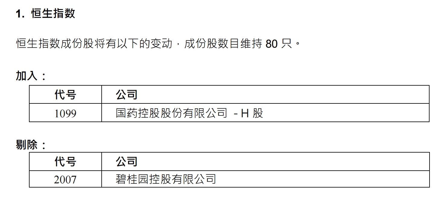 国药控股(01099)将被纳入恒生指数成份股。成份股数目维持80只。