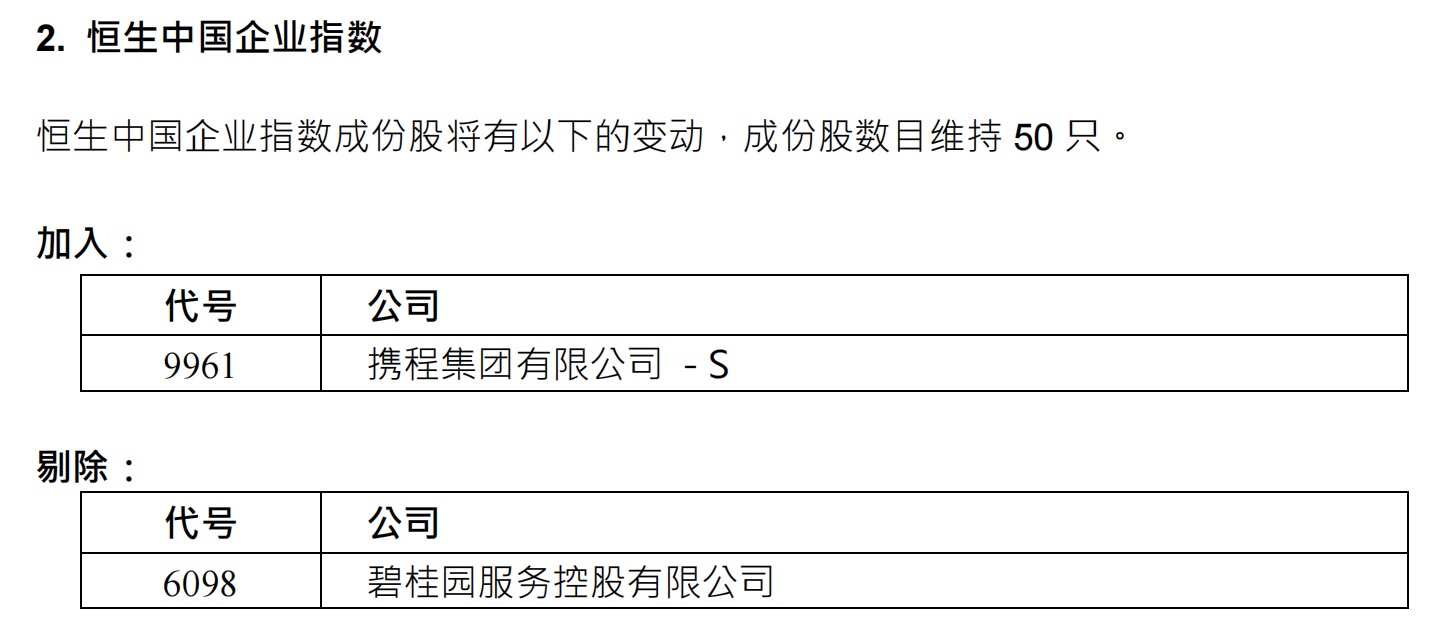 携程集团-S(09961)将被纳入恒生中国企业指数成份股。成份股数目维持50只。